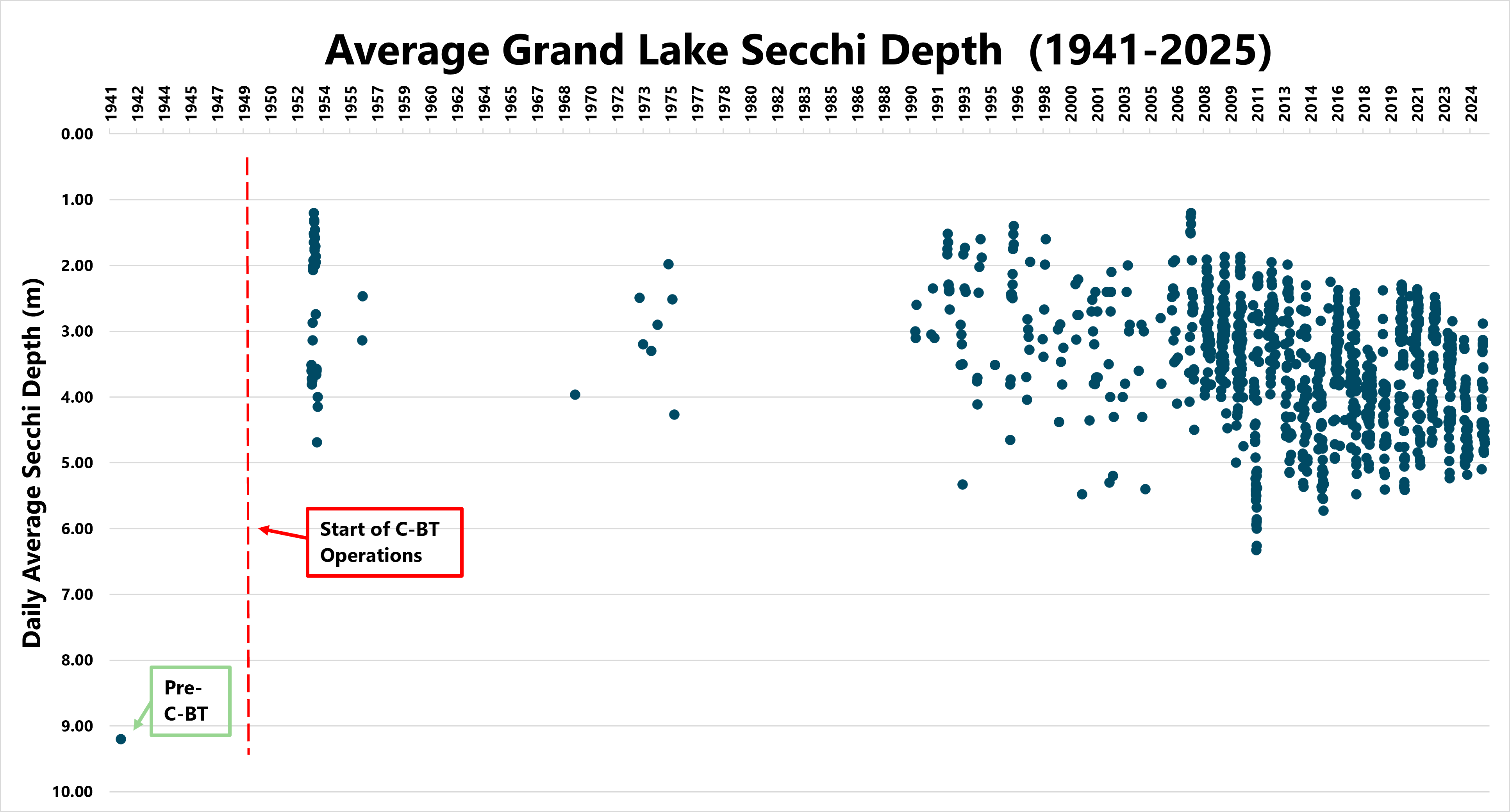 In September 1941, a Secchi depth reading of 9.2 meters (30 feet) was recorded at Grand Lake, before most C-BT facilities were built or operational. In June through September 1953, observers recorded Secchi depth readings ranging from 1.2 to 3.8 meters (4 to 12.5 feet) at Grand Lake. By this time the movement of C-BT water through Grand Lake was impacting clarity. However, the single 1941 Secchi depth does not adequately represent year-round clarity prior to C-BT construction since we know that clarity varies throughout the year due to natural influences such as spring runoff inflows. We continue to provide ongoing data analysis and reporting that shows that clarity in Grand Lake is improving, likely due to recent C-BT Project operational changes developed as part of the Grand Lake Adaptive Management process.